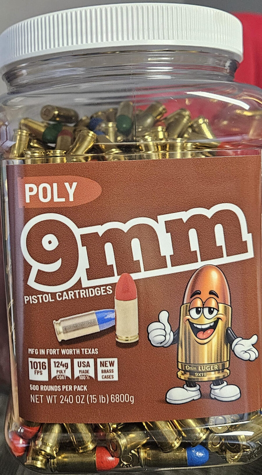 124gr poly-coated pistol cartridges. 500 rounds per container. New brass cases. Made in Fort Worth, Texas.